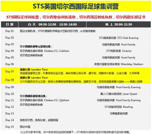 在英伦古镇哈斯廷(在英国东南部海滨,距离伦敦月80 公里)集中培训英语1 周,此课程经过英国大使馆文化教育处认证;足球训练在切尔西俱乐部训练场;训练分组不分国籍,每组12-14 人;上午学习进攻、防守、射门等技巧,下午在教练的指导下分组比赛,或者参观其它名气十足的足球场,还有机会与多名大牌球星见面,与来自世界各地的朋友一起学习英语并同场竞技。